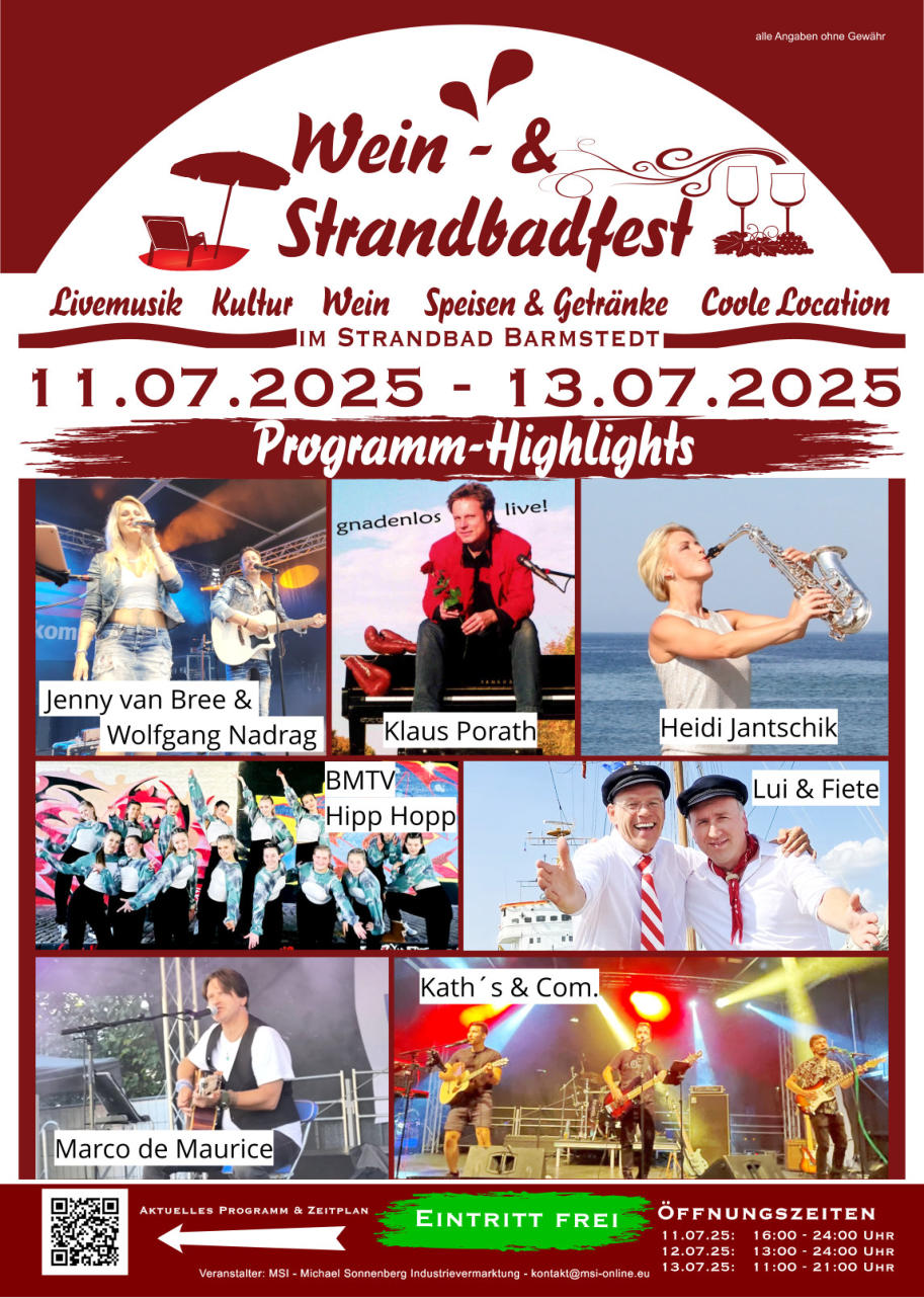 Das Wein- & Strandbadfest Barmstedt öffnet seine Türen im Strandbad Rantzauer See – vom 11.07. – 13.07.2025 ist es soweit!Markiert euch den Termin rot und dick im Kalender. Freut Euch und genießt das Ambiente am Rantzauer und die Leckereien!Musik, laue Sommerabende und ein gutes Gläschen Wein oder ein kühles Bier, dabei Freunde treffen, nette Gespräche führen oder nur chillen und den Feierabend genießen – diese Worte spiegeln den Barmstedter Weingarten wider.